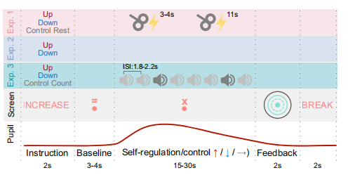 在这里,只报告基于瞳孔的生物反馈训练第3天的数据,同时记录了脑电图和心电图数据。在每次训练中,受试者共进行60个试次,分为3个上调和3个下调block,每个block由10个试次组成。实验开始时,对瞳孔大小的调节方向进行2秒的提示(放大或缩小瞳孔大小),然后进行3秒的基线测量。在接下来的实验中,受试者在调节阶段运用他们的心理策略来调节瞳孔直径的大小。