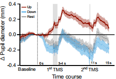 图6 在每次经颅磁刺激脉冲前的 150 毫秒内,在上调、下调和对照条件下,瞳孔大小均有所变化。