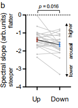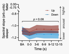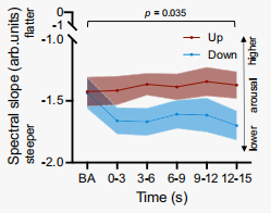 瞳孔调节指数(上调 - 下调)与频谱斜率变化(上调 - 下调)之间存在显著的正相关,因此,更好的瞳孔自我调节与更大的频谱斜率差异相关(图10)。
